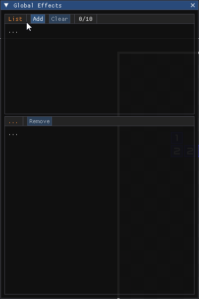 Global Effects allow you to apply shaders to the entire theme. These can be very graphically intensive and are advised to use sparingly. You are currently limited to 10 Global Effects.