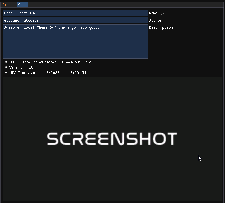 At the bottom of the panel, the Open button launches the selected theme in the Theme Builder for editing.